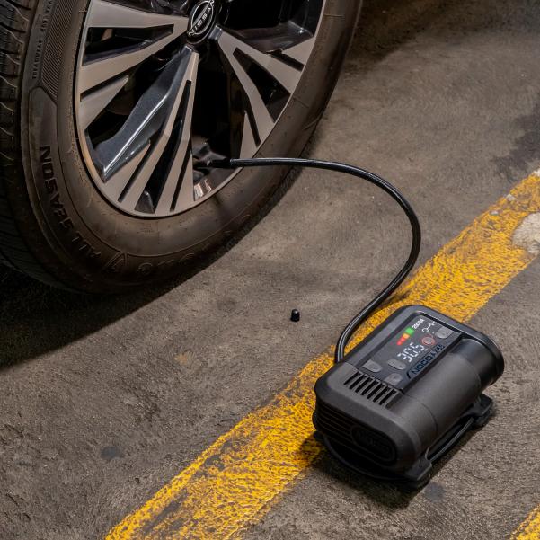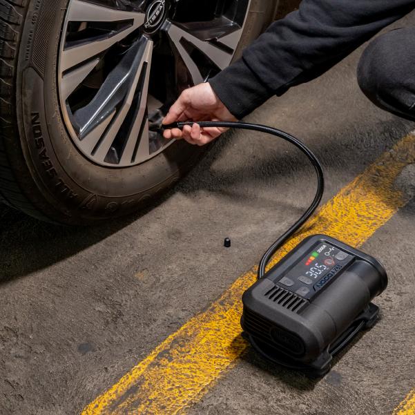 Connect the air hose on the AX65 to the tire before starting inflation. The air hose will screw onto the tire's air valve. No tools are necessary and should be hand tightened.