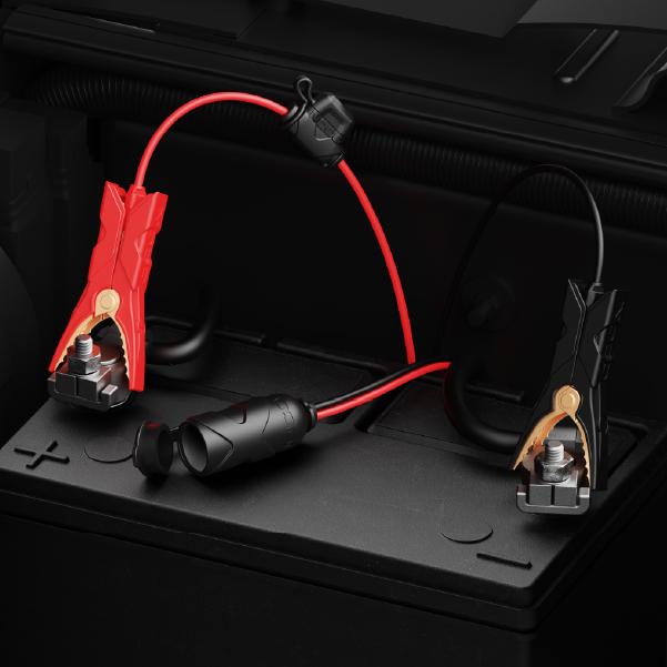 The 12V Adapter Plug with Battery Clamps connects directly to your battery with integrated battery clamps.