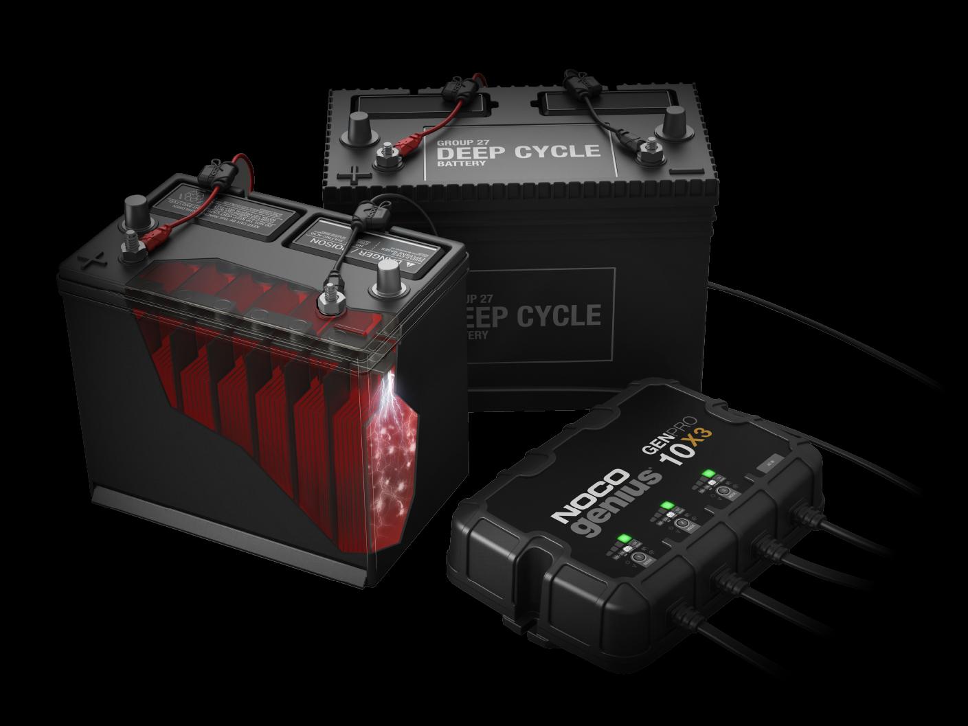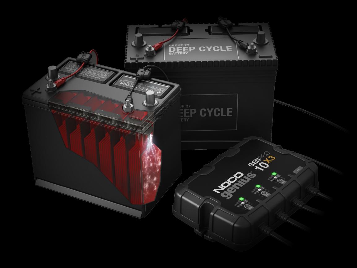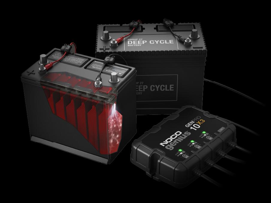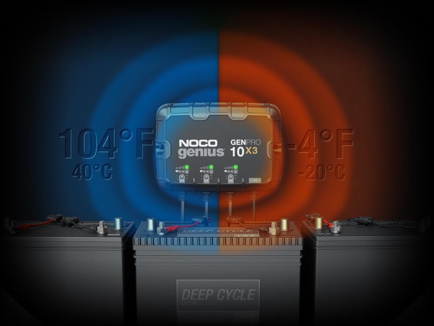 Meet the all-new GENPRO10X3. Similar to our GEN3, only better. It's 19% smaller and delivers 33% more power. It's one of the best performing onboard marine battery chargers we have ever made. A three-bank onboard battery charger rated at 30-amps (10-amps per bank) for 12-volt batteries, including marine, boat, starter, and deep-cycle batteries. Independently charge and control each battery bank with selectable charging modes - including 12V, 12V AGM, 12V Lithium, and 12V Repair Mode - for all types of lead-acid and lithium-ion batteries.