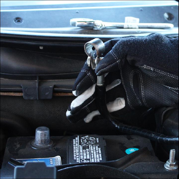 Carefully remove the cables from each battery terminals using a wrench. Always remove the negative (-) cable first to prevent sparks. Inspect the cables for cracks and other damages before moving on.